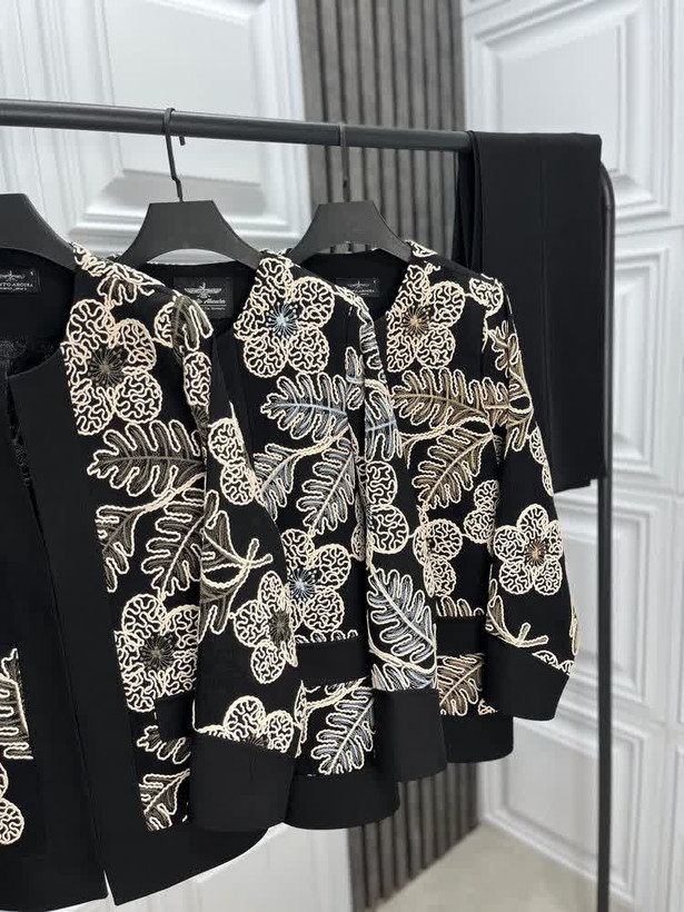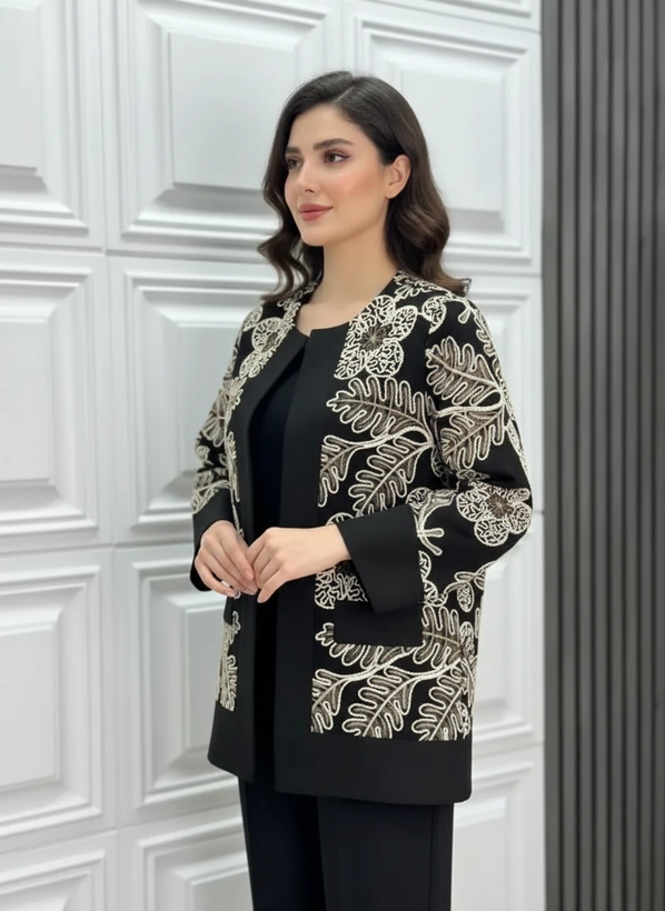 کت زنانه بزیاق دانتل دوزی مدل آریستا یکی از مدلهای خاص در میان کتهای مجلسی زنانه است. ترکیب پارچه بزیاق با دانتل دوزی ظریف، جلوهای لوکس و متفاوت ایجاد کرده که برای استایلهای رسمی و مهمانی بسیار مناسب است.