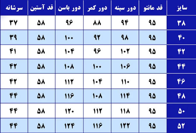 عرض سینه: عرض سینه سایز یک 96 سانتیمتر، سایز دو 100 سانتیمتر، سایز سه 104 سانتیمتر و سایز چهار 108 سانتیمتر است