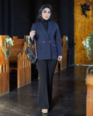از نظر ظاهری، یقه بزرگ و کلاسیک به مانتو شخصیتی رسمی میدهد، در حالیکه رنگهای سرمهای و مشکی حس جدیت و وقار را منتقل میکنند. طول ۷۰ سانتیمتری مانتو باعث میشود فرم بدن کاملاً شیک و متناسب دیده شود، بدون آنکه در حرکت محدودیتی احساس شود.